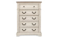 Complete your bedroom ensemble with the New Classic Furniture Anastasia 5 Drawer Chest in Antique White, a testament to real wood craftsmanship with solid poplar and oak veneer for enduring durability. The heirloom finish, achieved through a meticulous multi-step process involving wire brushing, clefts, rasping, threading, and rub throughs, grants each chest an upscale, vintage look, ensuring that no two pieces are exactly alike. The creamy off-white stain, enriched with brown and gray burnishing, radiates vintage French country cottage charm, accentuated by a rustic brown finish top that encapsulates the antique, old-world charm. The chest's graceful composition is defined by picture frame drawer fronts, bracket feet, detailed crown molding aprons, and chamfered panel appliques, complemented by antique gold drop ball drawer pulls. Drawer operation is effortless with ball-bearing glides, providing a smooth and easy open performance. Enjoy clean and carefree storage with all drawers sanded and sealed, and top drawers lined with felt to safeguard delicates, watches, jewelry, and glasses. The bottom drawers are cedar-lined, offering a cozy haven for sweater storage. The time-tested quality is evident in the four-corner English dovetail joinery, ensuring a strong and durable piece of furniture.