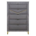 The Symmetry 5-Drawer Chest in Charcoal Gray blends form and function with modern elegance. Crafted from premium woods with a gray marble laminate, it offers durability and a sleek aesthetic. Ultra-soft gray fabric drawer fronts, adorned with gold metal and mylar accents, add sophistication. English dovetail drawers glide smoothly on ball bearings for lasting strength. Providing ample storage and style, this chest is a perfect choice for enhancing any living space with elegance and utility.