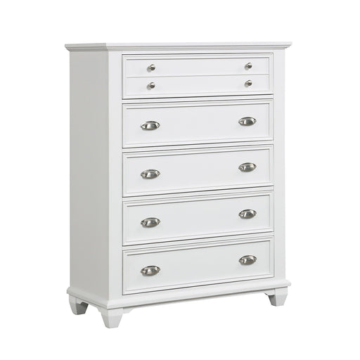 New ClassicComplete your bedroom ensemble with the New Classic Furniture Anastasia 5 Drawer Chest in Antique White, a testament to real wood craftsmanship wit...