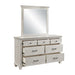 The Silver Sands Mirror showcases durable, quality construction, crafted from solid pine and oak wood veneers for a beautifully framed piece. Its transitional style blends clean, simple lines with a rustic wood finish, creating a calm and inviting atmosphere. The misty gray finish, meticulously applied in multiple steps, gives a light, weathered look that highlights the wood's natural grain and mineral patterns. Elegant design elements, including a nicely shaped crown and dentil moldings, add a sophisticated touch. The low-distortion mirror ensures a clear, accurate reflection, making it a practical and stylish addition to any room. Combining functionality and elegance, this mirror enhances both traditional and modern decor styles.