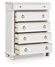 Taking a laid-back approach to casual traditional design, this artfully crafted chest of drawers combines classic elements with a clean modern approach. Its rubbed antiqued finish exudes a comfy, timeless appeal that's sure to carry you away to a dreamy time and place. Simple round metal knobs and ring pulls on the chest's spacious drawers make just the right statement.