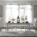 Create a grand gathering with the Magnolia Manor optional table set, consisting of splat back side chairs and a rectangular table. Crafted of poplar solids with cathedral white oak veneer, this kit features an antique white finish with heavy chipping and a weathered brown top with whitewash. The table offers a fancy face top, canted corners, two 18" leaves to easily accommodate guests or a large family and is anchored by faceted turned legs. The chairs feature the perfect blend of European design with a saddle shaped seat, dog bone accents on the splat back, nylon chair glides to protect your flooring, and beautifully faceted turned legs. Warm antique finishes and artistic distressing along with grand scale create a piece to be passed to generations.