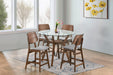 The Oscar 5-Piece Counter Height Dining Set features a round glass top table with a walnut wood base and 4 cushioned chairs. Crafted from solid rubberwood and walnut veneers with a clear topcoat, this set blends Mid-Century charm with modern durability. Reinforced chair stretchers and foam cushions offer comfort and support. A lower shelf adds style and function, while the compact footprint seats four comfortably—perfect for kitchens, nooks, or small spaces.