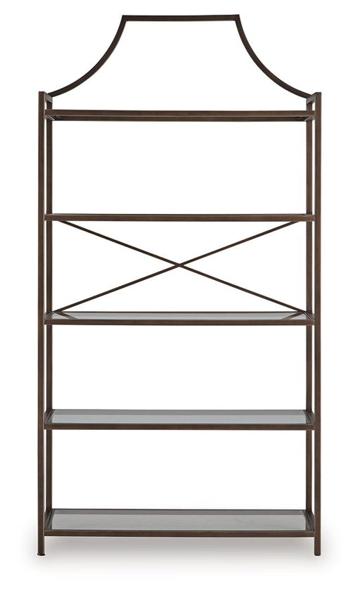 Signature Design by Ashley®Classic design effortlessly blends with modern functionality in this elegant bookcase. Its antiqued bronze-tone finish adds a touch of warmth and s...