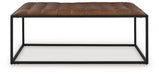 Master the art of casual chic with this coffee table ottoman. The soft, inviting top, upholstered in supple brown leather, is perfectly balanced by a clean-lined black metal base. Its expansive surface provides ample room for trays and books, making it a highly functional and oh-so-cool anchor for your seating area.