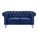 The New Classic Emma Chesterfield Velvet 2 Seat Sofa Loveseat is a blend of soft elegance and sophisticated design. Crafted from 100% polyester velvet fabric, it offers cozy and indulgent seating for two. The glam tailoring features tufted backs and arms adorned with glimmering crystal buttons, adding a touch of luxury without compromising comfort. Upscale accents, including silver nailhead trim on the rolled arms and silver turned bun feet, enhance the velvet fabric. Shipped unassembled for easy placement in any home, its lower profile height makes it small space-friendly, fitting well into smaller rooms while providing full-size seating. Enjoy supportive seating with full foam cushions that provide ample comfort. Add a little sparkle in your home with the Emma Loveseat.