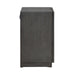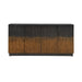 Features reeded pattern doors with abstract visual interest. The door pattern is reminiscent of a dancing flame. The doors are supported by European soft close hinges and a push latch system. There is one fixed wood shelf behind each outside door and one large fixed shelf behind the set of center doors. The case is supported by a plinth style base.