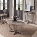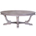Salvaged stone white wash finish with wire brushing creates a casual, refined appeal when combined with a traditional silhouette. Oval shaped cocktail features cabriole legs with a flat pedestal base.