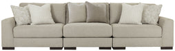 Distinguished yet unassuming, the versatile and visually appealing sectional adds a refined touch to any space. Inspired by the dapper look of fine tailored menswear, its rich texture turns heads, while a soft, neutral hue blends effortlessly with other colors in the room. Clean lines and wide track arms embrace a minimalist contemporary style. The sectional's modular design offers a variety of configurations for flexibility. Plush, reversible deep cushions provide extraordinary comfort and can be rotated for longer life. Accent pillows in soft shades of complementary colors add subtle contrast. This handsome piece will make a memorable impression again and again.