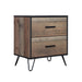 The Elk River Two Drawer Nightstand offers a seamless blend of functionality and rugged charm, making it an essential addition to any bedroom. This nightstand is meticulously crafted from eco-friendly manufactured woods and finished with a decorative laminate that is both scratch-resistant and durable, ensuring it maintains its heirloom-quality appearance over time. The rustic brown finish and weathered look lend an air of antiquity that complements its modern industrial design, highlighted by sturdy metal legs and cast iron trims for an edgy, loft-like vibe. Designed to provide ample storage, the nightstand features two drawers that are perfect for keeping bedside essentials organized and within easy reach. Each drawer is constructed with English dovetail joinery and operates on smooth Kenlin center glides, combining time-tested quality with exceptional ease of use. Whether paired with other pieces from the Elk River collection or as a standalone item, this nightstand enhances any bedroom with its practical elegance and striking aesthetic.