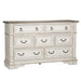 Blending of European traditional design influences makes Abbey Park a truly unique style for any living space. Warm antique finishes and artistic distressing along with grand scale makes Abbey Park a group to be passed to generations. The antique white finish with heavy chipping combines with the weathered brown white wash tops for a truly unique look. Bail and drop ring hardware in antique pewter add the finishing touch to the cases.