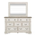 Design possibilities are endless with the Abbey Park sleigh bed, dresser, and mirror. Crafted of poplar solids and cathedral white oak veneers, this kit features an antique white finish with heavy chipping and weathered brown whitewash tops, full extension drawers, premium felt lined top drawers and cedar lined bottom drawers, and is accented with antique pewter bail pull and drop ring hardware. This sleigh bed features a rolled headboard and a bent rolled footboard, both upholstered in a beautiful, tufted chenille. The dresser has seven drawers and can equip the mirror that features a beveled edge with the included bolt-on supports. The blending of European traditional design influences makes Abbey Park a truly unique style for any living space.