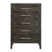 The Andover Five Drawer Wood Chest combines durability, functionality, and modern rustic style, making it an essential piece for any bedroom. Expertly crafted from solid Rubberwood, manufactured woods, and wood veneers, this chest is built to last while highlighting the natural beauty of real wood. The rich finish is the result of a meticulous multi-step process that includes sand-throughs and white glazing, imparting a weathered yet refined appeal that enhances the wood's natural grains and unique characteristics. The Andover chest’s clean lines and cohesive design are complemented by sleek, elongated metallic handles that add a sophisticated contrast to the dark wood finish. Framed drawer fronts add depth and dimension, while the sturdy block-style legs ensure a solid foundation that underscores the chest's robust and enduring structure. The drawers glide smoothly on Kenlin drawer glides, ensuring reliable operation, and feature dovetail joinery, reflecting superior craftsmanship and lasting quality. This chest offers ample storage space while enhancing your bedroom's aesthetic with its timeless and versatile design.