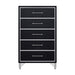 The Ava 5 Drawer Chest in Ebony blends modern sophistication with everyday functionality. Made from engineered wood with eco-friendly black laminate, it features silver mylar accents and sculpted legs for a glamorous finish. Five spacious drawers with English dovetail joinery and Kenlin glides offer smooth, durable storage. A perfect combination of luxury and practicality, this chest adds stylish charm to any bedroom.