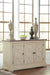 Need a stylish space to store dinnerware and all your dining room essentials? This server is a dream come true, with four adjustable shelves that offer large capacity and a spacious top that's perfect for setting a buffet. Embellished with the casual appeal of three latticed doors, an attractive planked top with a weathered oak finish and a lightly distressed white finish throughout, this vintage look will serve up elegance for years to come.