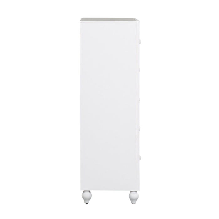 Indulge in cottage design with the Cottage View 5 drawer chest. Crafted by melamine and a rubberwood solid frame, this piece features kenlin drawer glides, bottom case dust proofing, solid wood picture framed molding, laminate drawer interior, bluff cut top drawers, wood knob hardware, and is anchored by bun feet. This piece is available in an alternate finish and the melamine is scratch resistant, sure to make this piece last in any home.