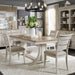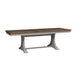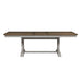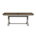 Wow family and friends with the Farmhouse Reimagined trestle table set. Crafted of pine and poplar solids with hickory and pine veneers, this set features an antique white finish with heavy wire brush distressing and a chestnut top and consists of the trestle table and four splat back side chairs. The trestle table features an 18” removable leaf on an easy glide track system for easy opening and is anchored by beautifully curved legs with a center trestle. The splat back side chairs offer beautiful detail on the back and has a padded upholstered seat in a khaki linen fabric with tapered legs and nylon chair glides to protect your flooring. Farmhouse Reimagined offers looks that easily work in today’s homes with style uncompromised and comfort abound.
