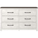 White rustic finish with replicated cedar grain accented with rustic gray planked replicated oak grain with authentic touch. Cases feature a framed front and pilasters. Contemporary handles in a dark pewter color finish. Side roller glides for smooth operating drawers. Drawer interiors lined with a replicated linen design for a clean, finished look. Queen (71) and king (72) headboards can attach to a bolt-on metal bed frame B100-31 or B100-66 respectively. Lighted bed option (54,56,57,58,98,99) with an abstract design. Queen and king panel headboards (57,58) feature decorative modern sconce lights in a matte black finish with champagne colored accents. Safety is a top priority, clothing storage units are designed to meet the most current standard for stability, ASTM F 2057 (ASTM International). Drawers extend out to accommodate maximum access to drawer interior while maintaining safety.