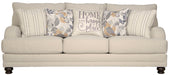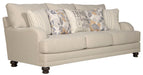 Jonesport is a Farmhouse Casual design and a piqué weave body fabric and a variety of decorative toss pillows. The modified Charles of London arm, t-front seat cushions and companion floral print Accent Chair and Cocktail Ottoman complete the look.