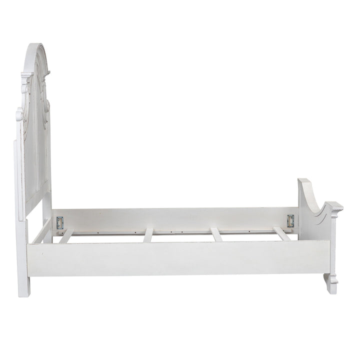 Accent your bedroom with the perfect blend of European Traditional design, using this unique panel bed. This wooden bed, constructed with poplar solids as well as oak & birch veneers, features an antiqued white finish accompanied by heavy chipping. The arched crowning and dog bone accents on each corner effortlessly add both definition and character, completing your look.