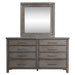 Inviting and inspirational describes the Modern Farmhouse dresser and mirror. Crafted of poplar solids with knotty oak veneers this kit features a dusty finish with heavy distressing, block style pilasters, flat front drawers, full extension drawers with premium felt lined top and cedar lined bottom drawers, accented with washed brass elongated bar pull hardware. The dresser has eight drawers and pairs well with the wood framed mirror with a beveled edge that can be attached with the included bolt-on supports. Inviting and Inspirational the Farmhouse look is a design style that works with cottage or contemporary. It is more about creating a look that we love.