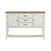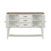 Summerville is a combination of style and function. The 48" square table features a storage pedestal base with two shelves. Combine the table with modern sophisticated styled chairs with square backs upholstered in a white leather with button tufted accents and sloped arms