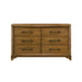 The Talcott 6 Drawer Dresser in honey finish is a perfect blend of durability and style, crafted from solid rubberwood, manufactured woods, and Mindy wood veneers for strength and stability. This transitional piece combines traditional and contemporary elements, featuring distinctive bracket feet, robust picture frame moldings, and sleek elongated drawer pulls. The hand-rubbed, multi-step finish highlights the wood's natural beauty, while premium dovetail joinery and ball-bearing glides ensure smooth, full-extension drawer operation. With six spacious drawers, including velvet-lined top drawers for delicate items, this dresser offers ample clothing storage and a unique, modern flair, making it a stylish and practical addition to any bedroom.