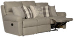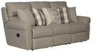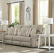 The WESTPORT lay flat reclining sofa features a Farmhouse Casual style with its Greek Key arm treatment, soft body fabric, and 5 included accent pillows.