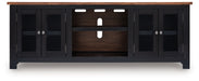 Raise the bar on modern farmhouse style with the Wildenauer TV stand. Its sturdy silhouette and casual good looks are accentuated with a two-tone finish, which pairs a warm satin black base with a contrasting butcher block veneer top. Glass door cabinets with adjustable shelves offer plenty of storage for media and electronics. And removing the center cabinet’s shelf allows room for the optional fireplace insert (sold separately), adding instant warmth and romance. Whether your style is vintage, country or eclectic, this TV stand adds a hearty element.